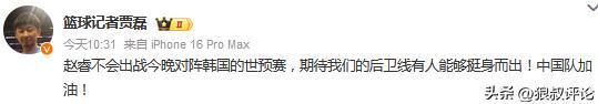 篮球记者贾磊发文点评:赵睿不会出战今晚对阵韩国的世预赛,期待我们的后卫线有人能够挺身而出!中国队加油!
